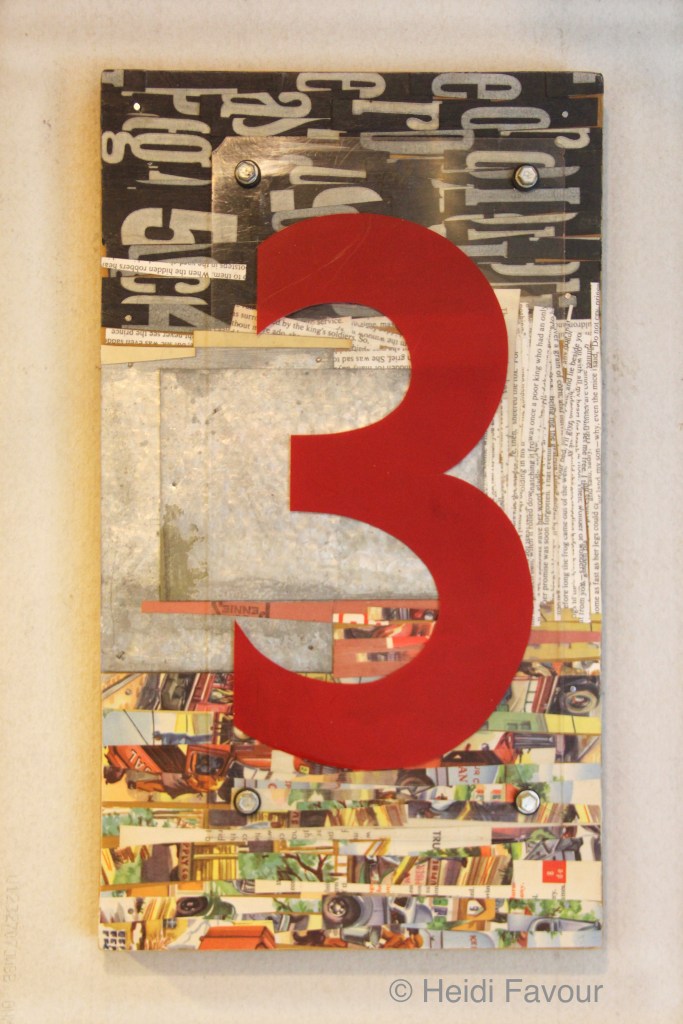 Materials: salvaged plywood, sign, metal, vintage ephemera, book pages