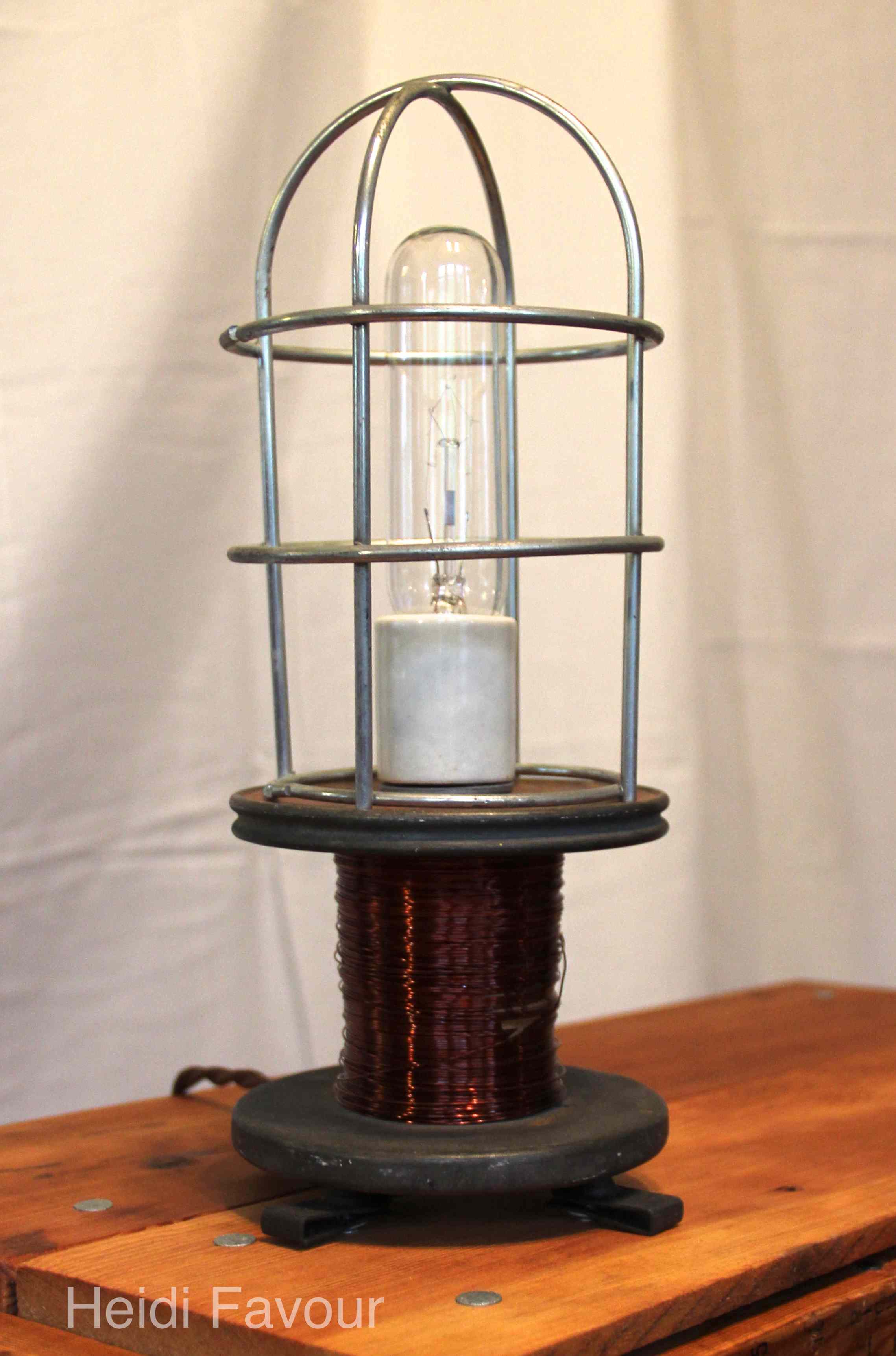 Materials: spool with copper wire, vintage light bulb cage, porcelain socket, vintage style bulb, cloth covered electrical cord, misc hardware.