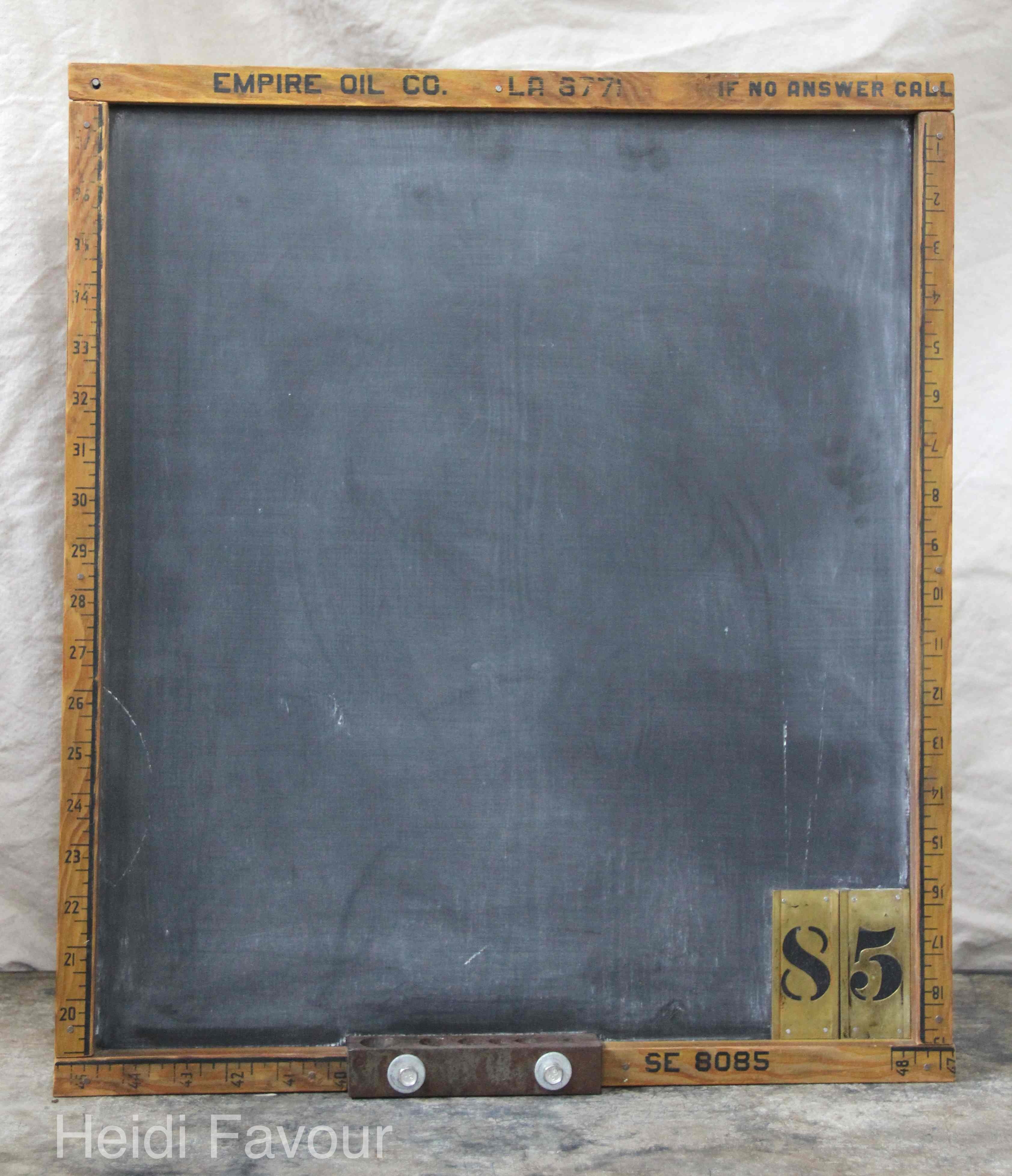 Materials: reclaimed plywood, vintage brass stencils, misc hardware, vintage yardstick from oil company, chalkboard paint.