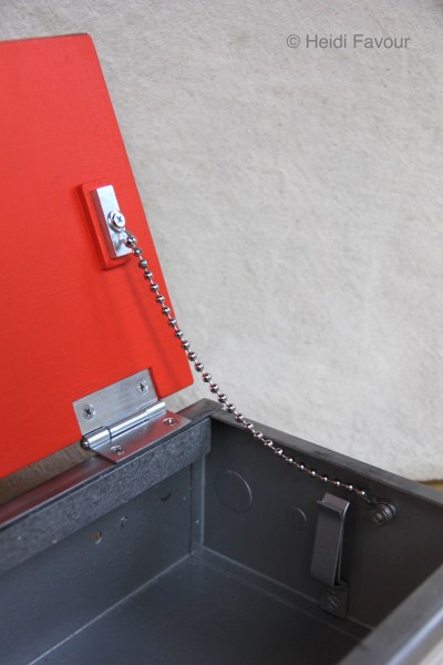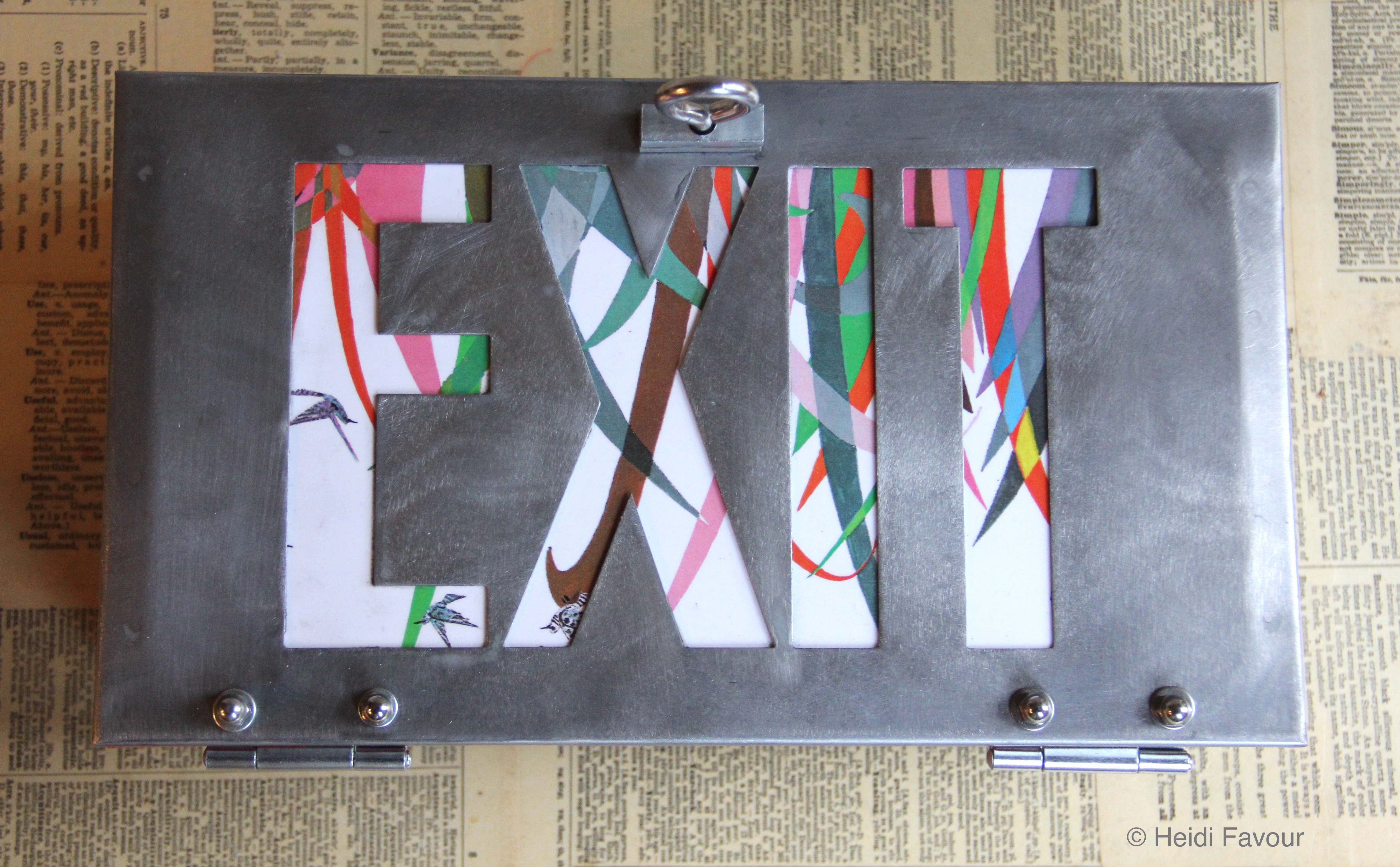 Materials: vintage exit sign, book illustrations, plywood, hardware, paint