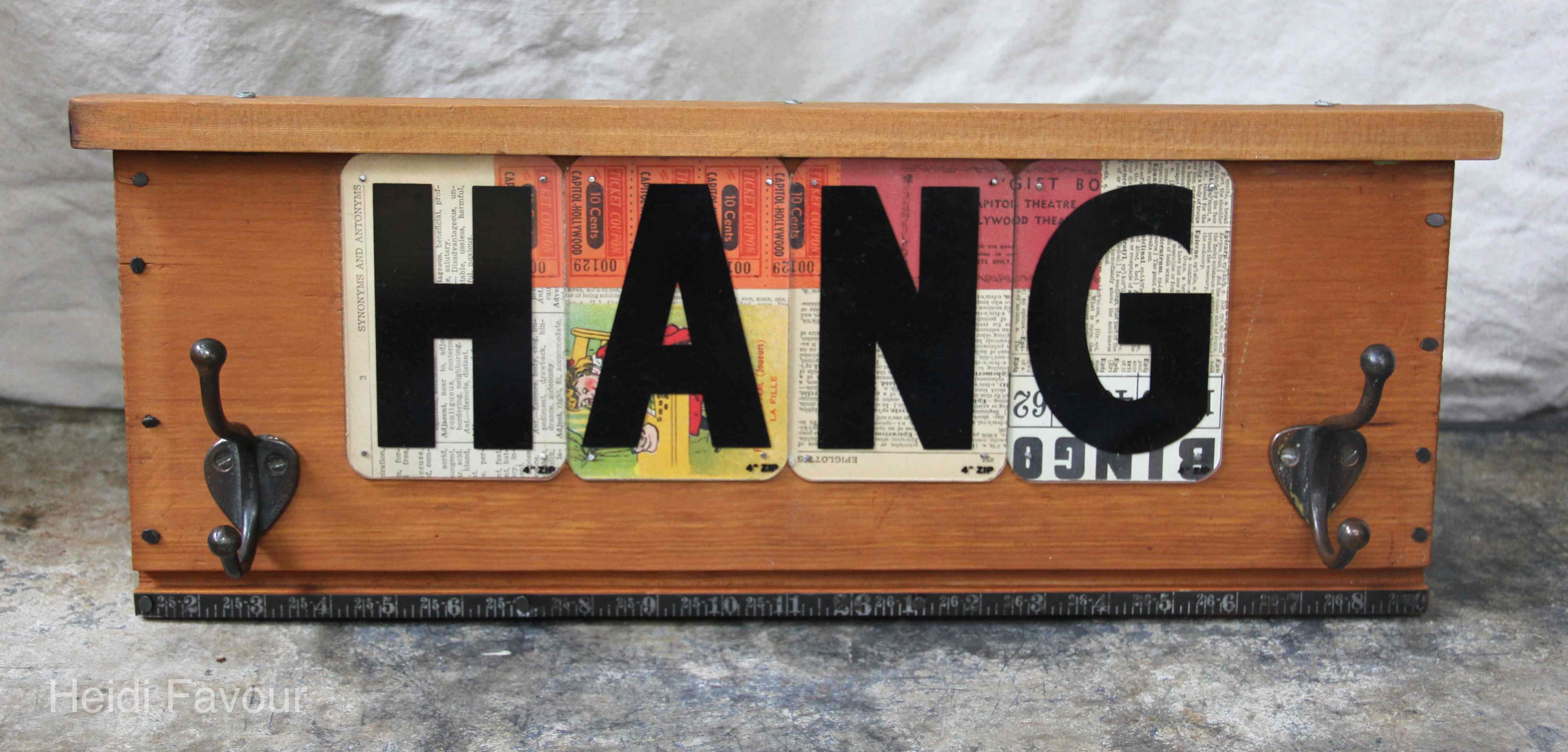 Materials: reclaimed wood, “zip” letters, vintage hooks, vintage ephemera, metal tape measure.