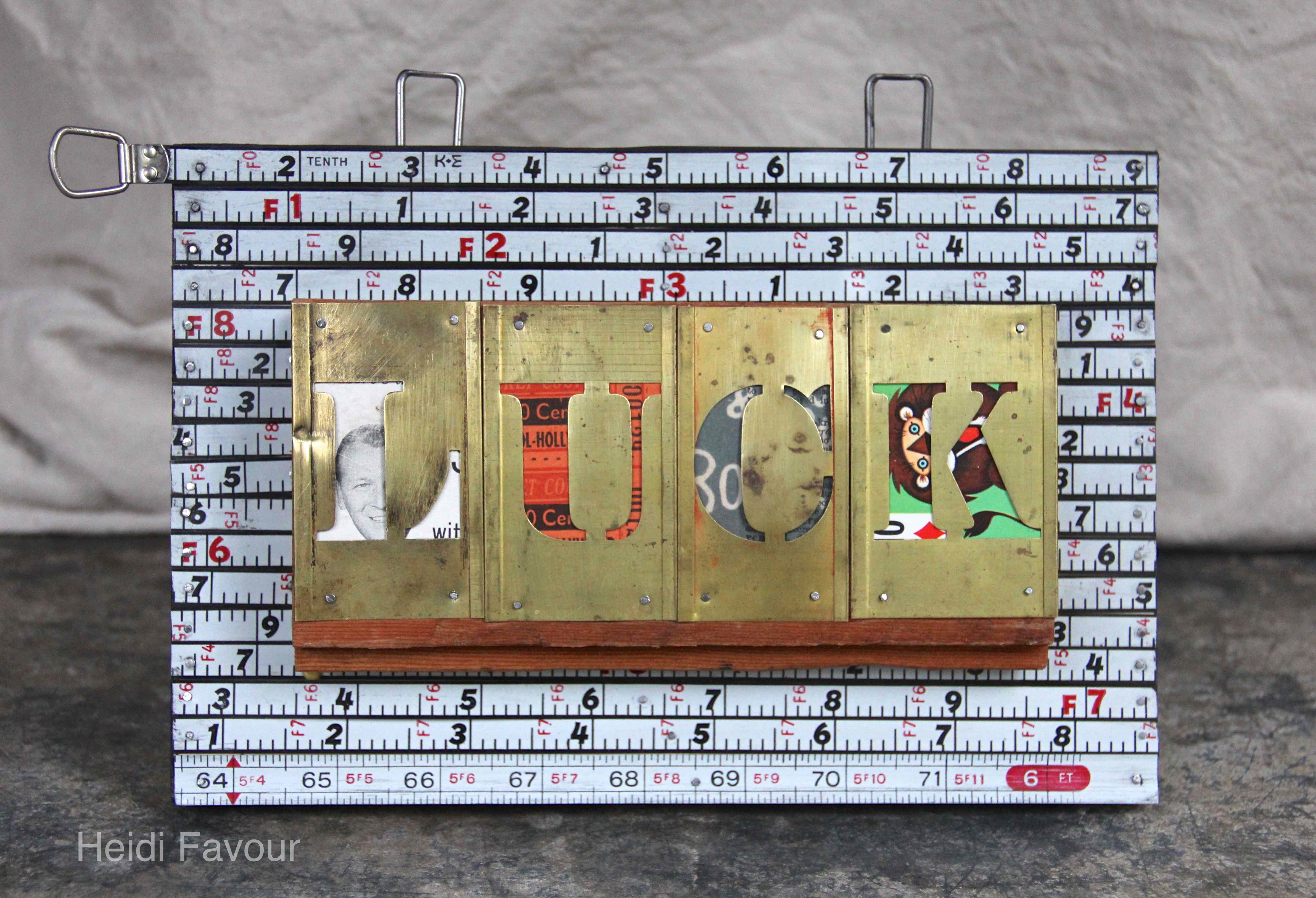 Materials: metal tape measure, vintage brass stencils and ephemera, salvaged douglas fir flooring.