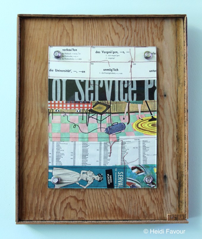 Materials: salvaged plywood, vintage ephemera, thread, glass, rulers, boltsSize: approximately 12″ x 14″ x 1″