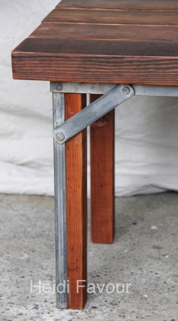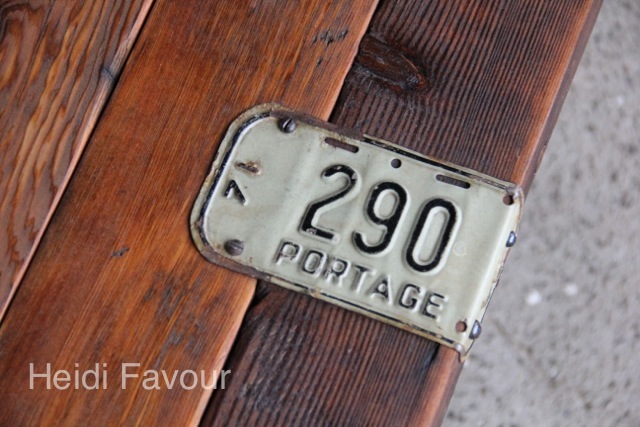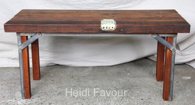 Materials: salvaged metal stand, salvaged douglas fir, vintage license plates.