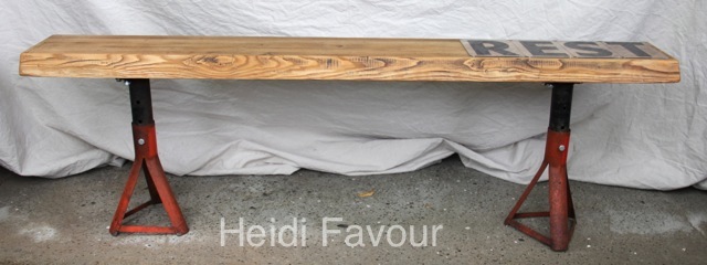 Materials: car jacks, reclaimed wood, “zip” letters.